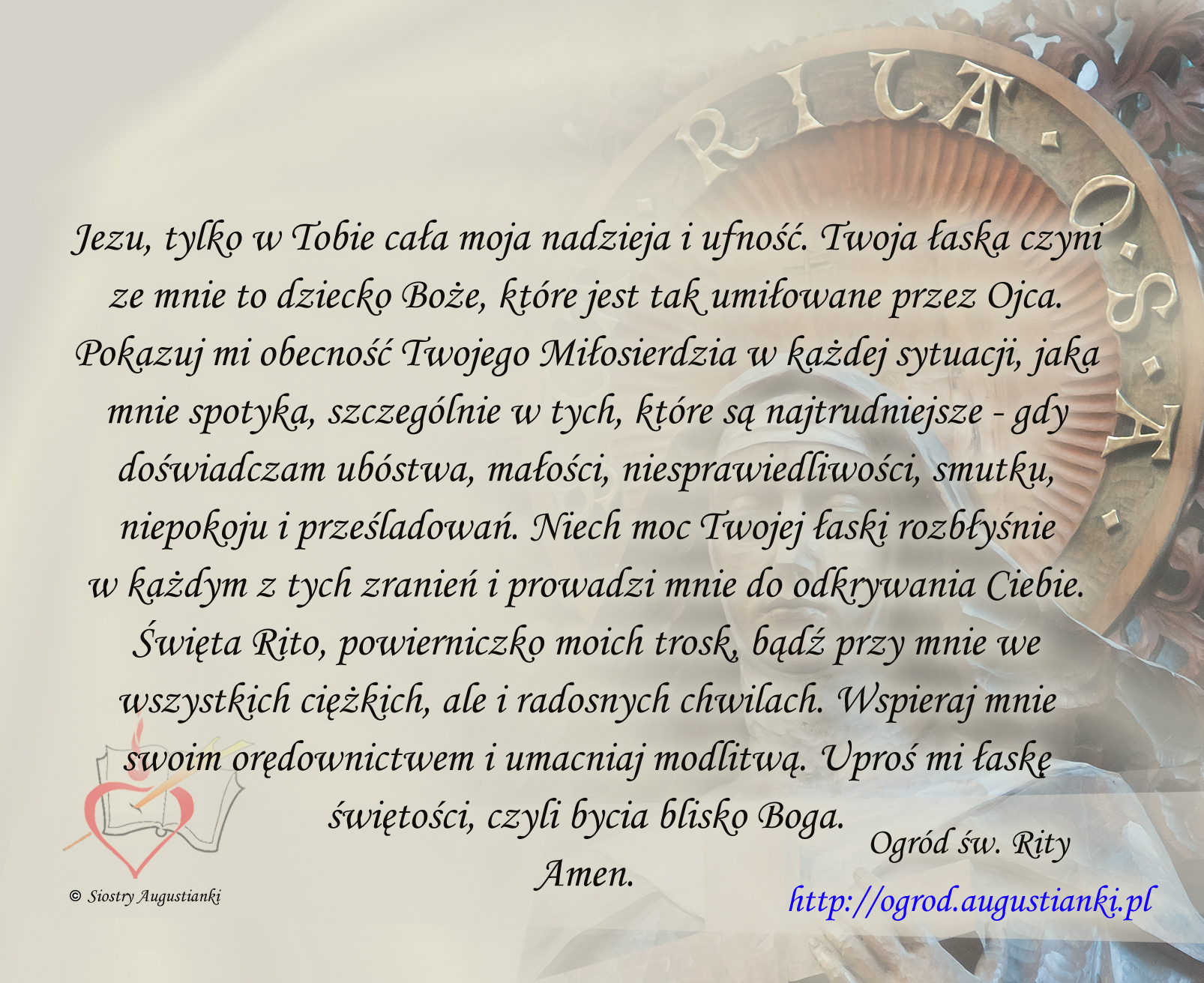 Święta Rito, powierniczko moich trosk, bądź przy mnie we wszystkich ciężkich, ale i radosnych chwilach. Wspieraj mnie swoim orędownictwem i umacniaj modlitwą. Uproś mi łaskę świętości, czyli bycia blisko Boga. Amen.