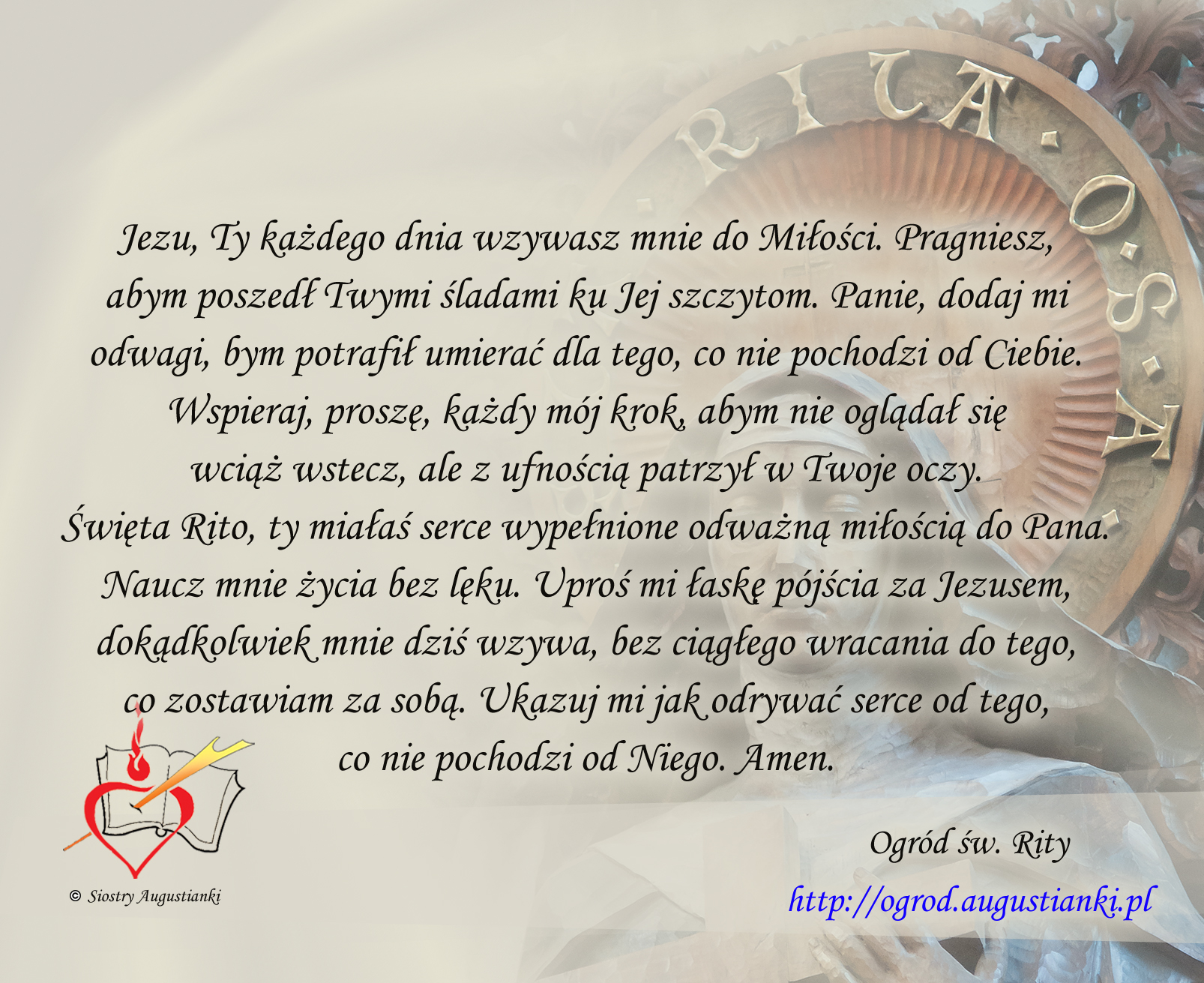 Święta Rito, ty miałaś serce wypełnione odważną miłością do Pana. Naucz mnie życia bez lęku. Uproś mi łaskę pójścia za Jezusem, dokądkolwiek mnie dziś wzywa, bez ciągłego wracania do tego, co zostawiam za sobą. Ukazuj mi jak odrywać serce od tego, co nie pochodzi od Niego. Amen.