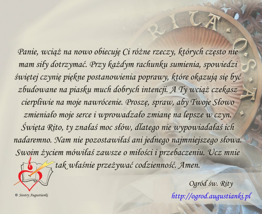 Święta Rito, ty znałaś moc słów, dlatego nie wypowiadałaś ich nadaremno. Nam nie pozostawiłaś ani jednego najmniejszego słowa. Swoim życiem mówiłaś zawsze o miłości i przebaczeniu. Ucz mnie tak właśnie przeżywać codzienność. Amen.