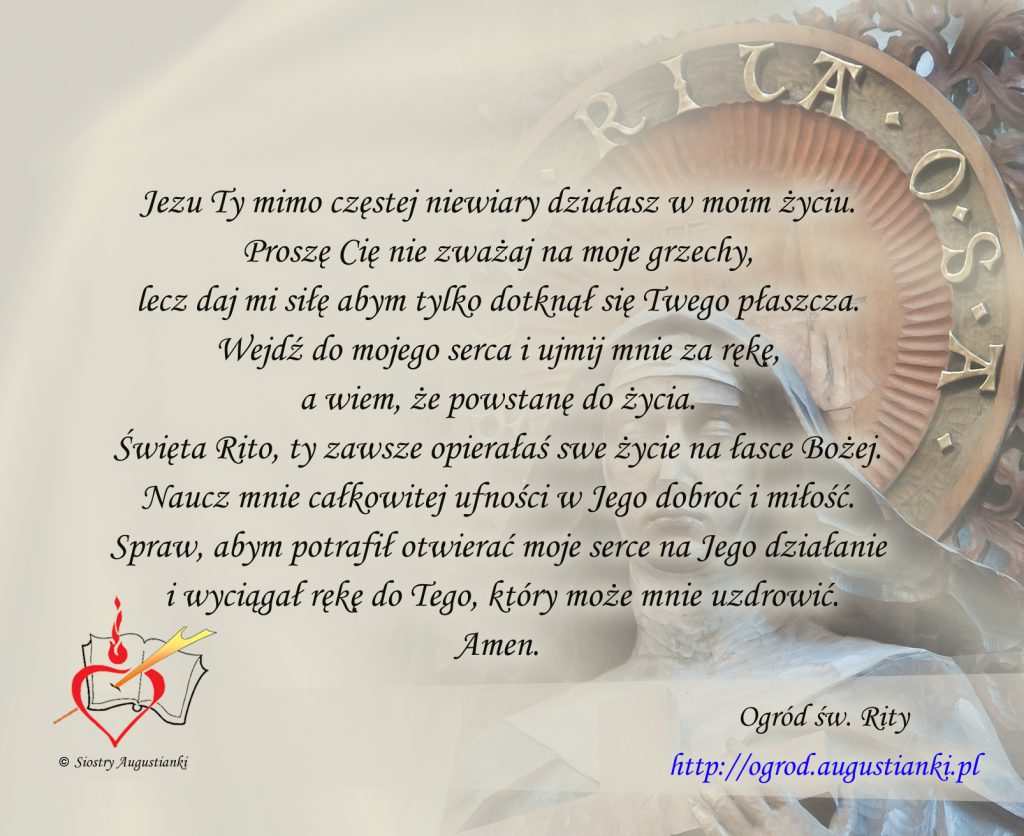 Święta Rito, ty zawsze opierałaś swe życie na łasce Bożej. Naucz mnie całkowitej ufności w Jego dobroć i miłość. Spraw, abym potrafił otwierać moje serce na Jego działanie i wyciągał rękę do Tego, który może mnie uzdrowić. Amen.