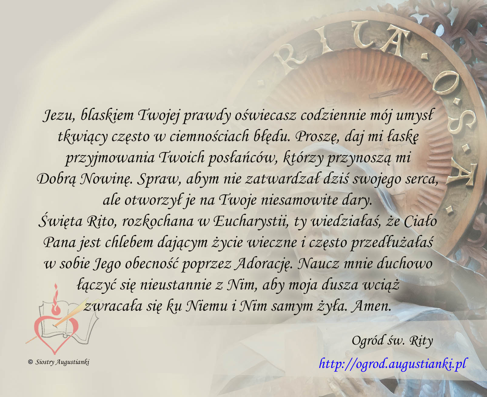 Święta Rito, rozkochana w Eucharystii, ty wiedziałaś, że Ciało Pana jest chlebem dającym życie wieczne i często przedłużałaś w sobie Jego obecność poprzez Adorację. Naucz mnie duchowo łączyć się nieustannie z Nim, aby moja dusza wciąż zwracała się ku Niemu i Nim samym żyła. Amen.