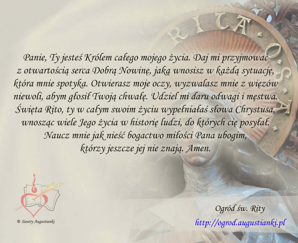 Święta Rito, ty w całym swoim życiu wypełniałaś słowa Chrystusa, wnosząc wiele Jego życia w historię ludzi, do których cię posyłał. Naucz mnie jak nieść bogactwo miłości Pana ubogim, którzy jeszcze jej nie znają. Amen.
