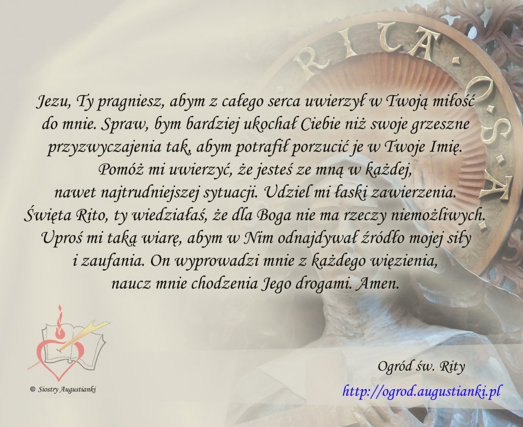 Święta Rito, ty wiedziałaś, że dla Boga nie ma rzeczy niemożliwych. Uproś mi taką wiarę, abym w Nim odnajdywał źródło mojej siły i zaufania. On wyprowadzi mnie z każdego więzienia, naucz mnie chodzenia Jego drogami. Amen.