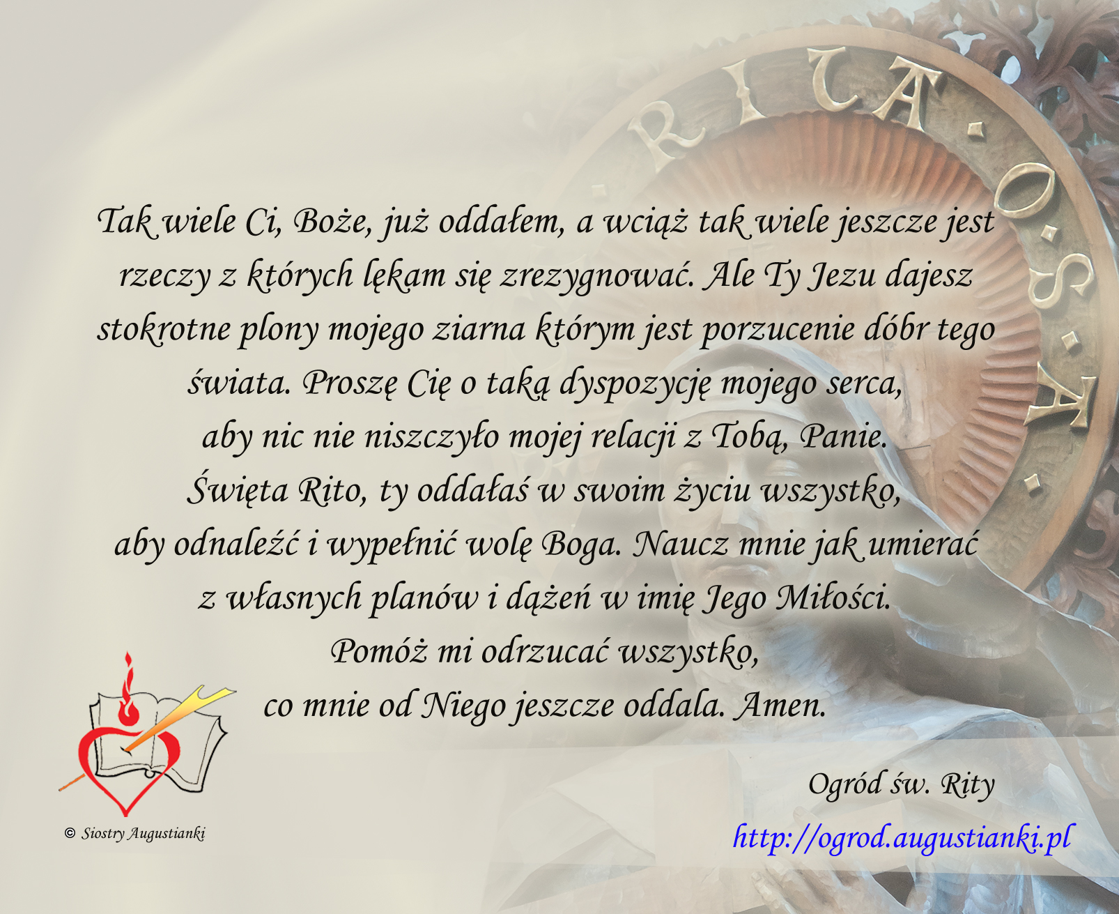 Święta Rito, ty oddałaś w swoim życiu wszystko, aby odnaleźć i wypełnić wolę Boga. Naucz mnie jak umierać z własnych planów i dążeń w imię Jego Miłości. Pomóż mi odrzucać wszystko, co mnie od Niego jeszcze oddala. Amen.
