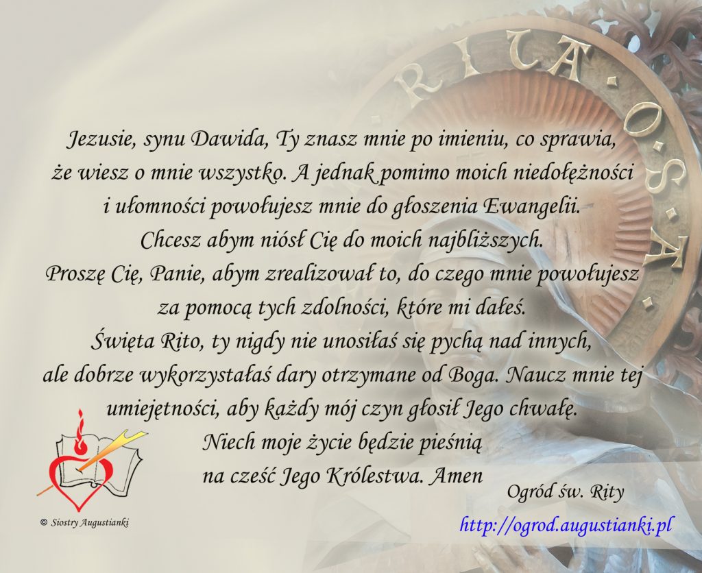 Święta Rito, ty nigdy nie unosiłaś się pychą nad innych, ale dobrze wykorzystałaś dary otrzymane od Boga. Naucz mnie tej umiejętności, aby każdy mój czyn głosił Jego chwałę. Niech moje życie będzie pieśnią na cześć Jego Królestwa. Amen.
