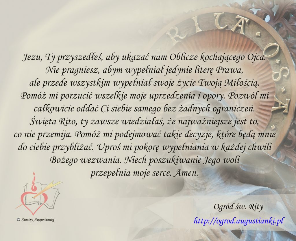 Święta Rito, Patronko życia zakonnego, która w heroiczny sposób wypełniałaś śluby czystości, ubóstwa i posłuszeństwa, a teraz wstawiasz się za nami u Pana, uproś dar nowych powołań do Zgromadzenia Sióstr Augustianek. Niech młode dziewczęta, chcące iść drogą augustiańskiego charyzmatu, czyli też Twoją drogą, odważnie odpowiedzą na ten cichy głos Pana w ich sercu. Amen.