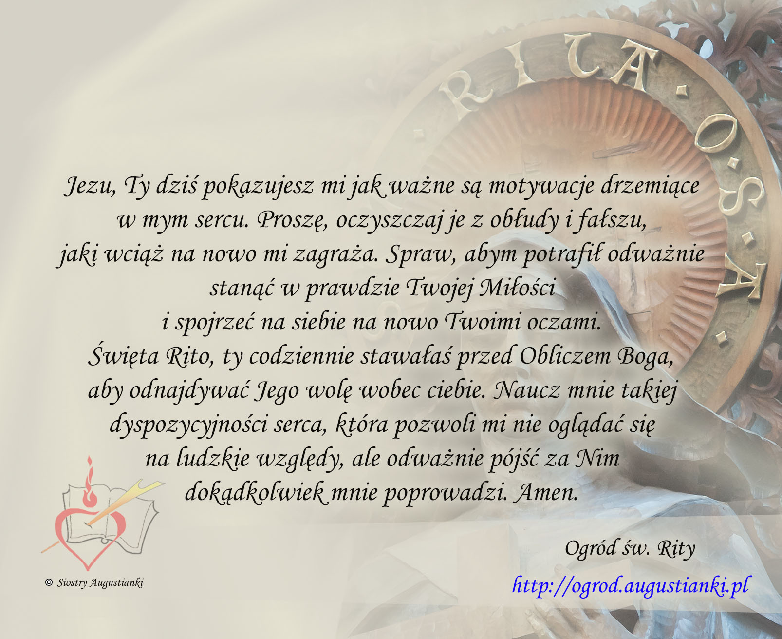 Święta Rito, ty codziennie stawałaś przed Obliczem Boga, aby odnajdywać Jego wolę wobec ciebie. Naucz mnie takiej dyspozycyjności serca, która pozwoli mi nie oglądać się na ludzkie względy, ale odważnie pójść za Nim dokądkolwiek mnie poprowadzi. Amen.