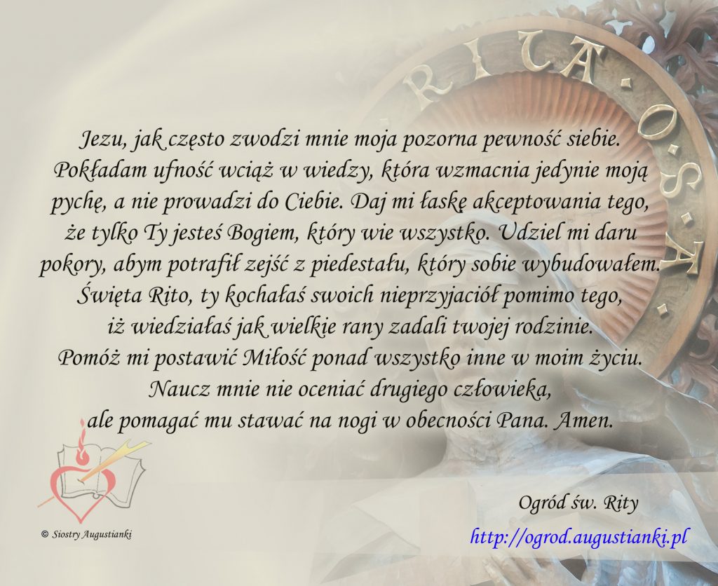 Święta Rito, ty kochałaś swoich nieprzyjaciół pomimo tego, iż wiedziałaś jak wielkie rany zadali twojej rodzinie. Pomóż mi postawić Miłość ponad wszystko inne w moim życiu. Naucz mnie nie oceniać drugiego człowieka, ale pomagać mu stawać na nogi w obecności Pana. Amen.