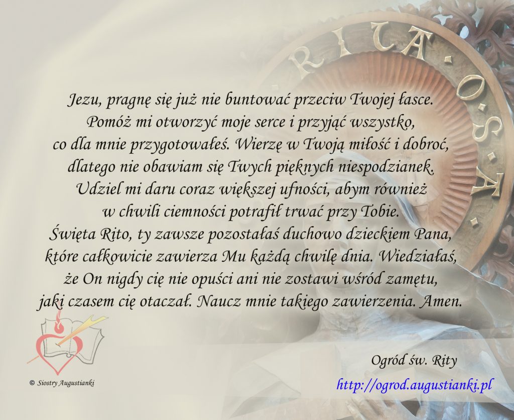Święta Rito, ty zawsze pozostałaś duchowo dzieckiem Pana, które całkowicie zawierza Mu każdą chwilę dnia. Wiedziałaś, że On nigdy cię nie opuści ani nie zostawi wśród zamętu, jaki czasem cię otaczał. Naucz mnie takiego zawierzenia. Amen.