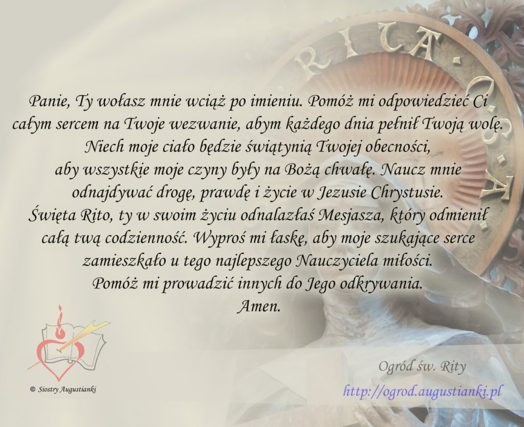 Święta Rito, ty w swoim życiu odnalazłaś Mesjasza, który odmienił całą twą codzienność. Wyproś mi łaskę, aby moje szukające serce zamieszkało u tego najlepszego Nauczyciela miłości. Pomóż mi prowadzić innych do Jego odkrywania. Amen.