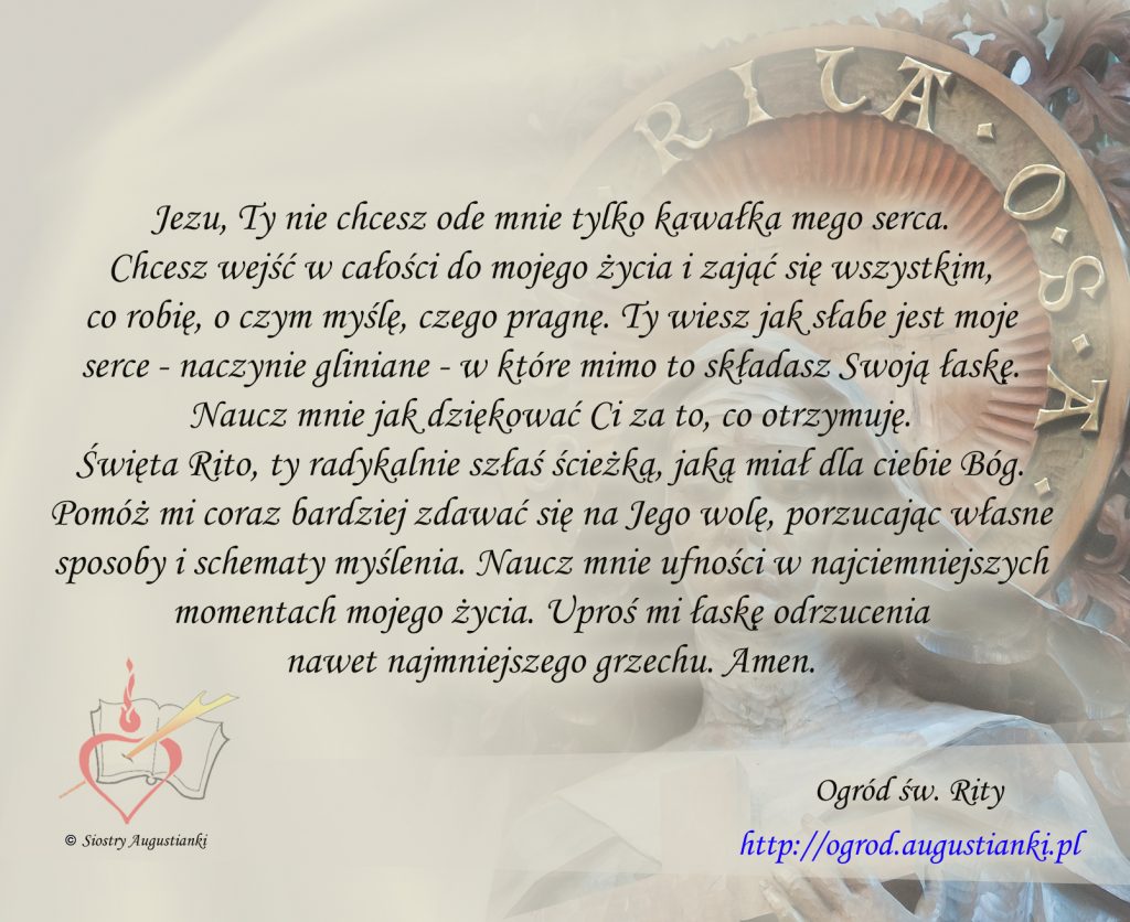 Święta Rito, ty radykalnie szłaś ścieżką, jaką miał dla ciebie Bóg. Pomóż mi coraz bardziej zdawać się na Jego wolę, porzucając własne sposoby i schematy myślenia. Naucz mnie ufności w najciemniejszych momentach mojego życia. Uproś mi łaskę odrzucenia nawet najmniejszego grzechu. Amen.
