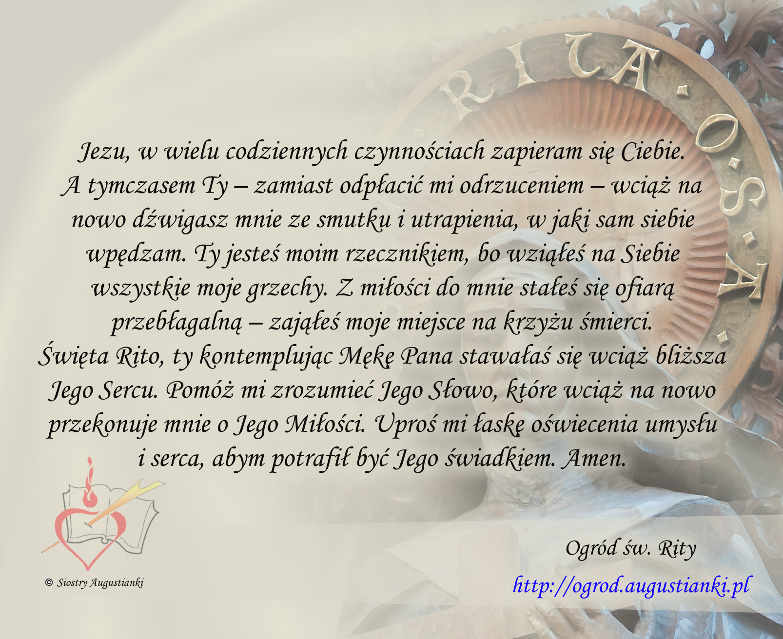 Święta Rito, ty kontemplując Mękę Pana stawałaś się wciąż bliższa Jego Sercu. Pomóż mi zrozumieć Jego Słowo, które wciąż na nowo przekonuje mnie o Jego Miłości. Uproś mi łaskę oświecenia umysłu i serca, abym potrafił być Jego świadkiem. Amen.