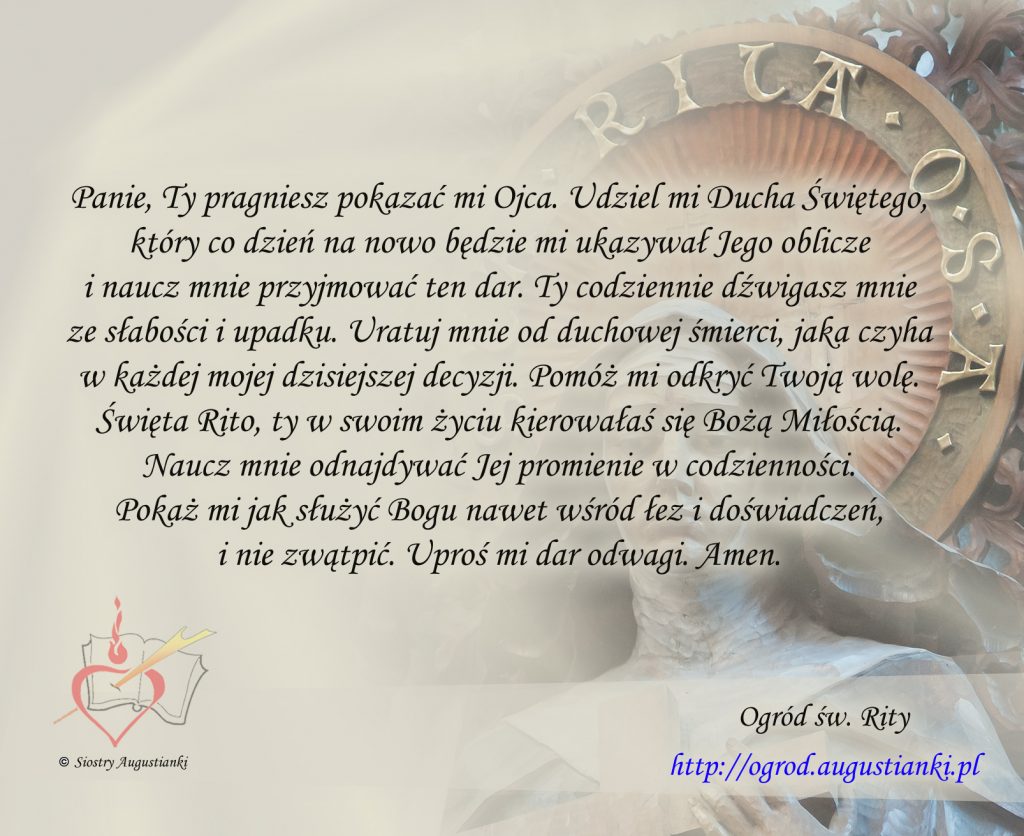 Święta Rito, ty w swoim życiu kierowałaś się Bożą Miłością. Naucz mnie odnajdywać Jej promienie w codzienności. Pokaż mi jak służyć Bogu nawet wśród łez i doświadczeń, i nie zwątpić. Uproś mi dar odwagi. Amen.