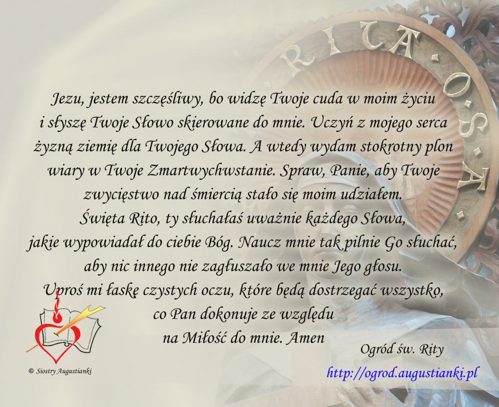 Święta Rito, ty słuchałaś uważnie każdego Słowa, jakie wypowiadał do ciebie Bóg. Naucz mnie tak pilnie Go słuchać, aby nic innego nie zagłuszało we mnie Jego głosu. Uproś mi łaskę czystych oczu, które będą dostrzegać wszystko, co Pan dokonuje ze względu na Miłość do mnie. Amen.
