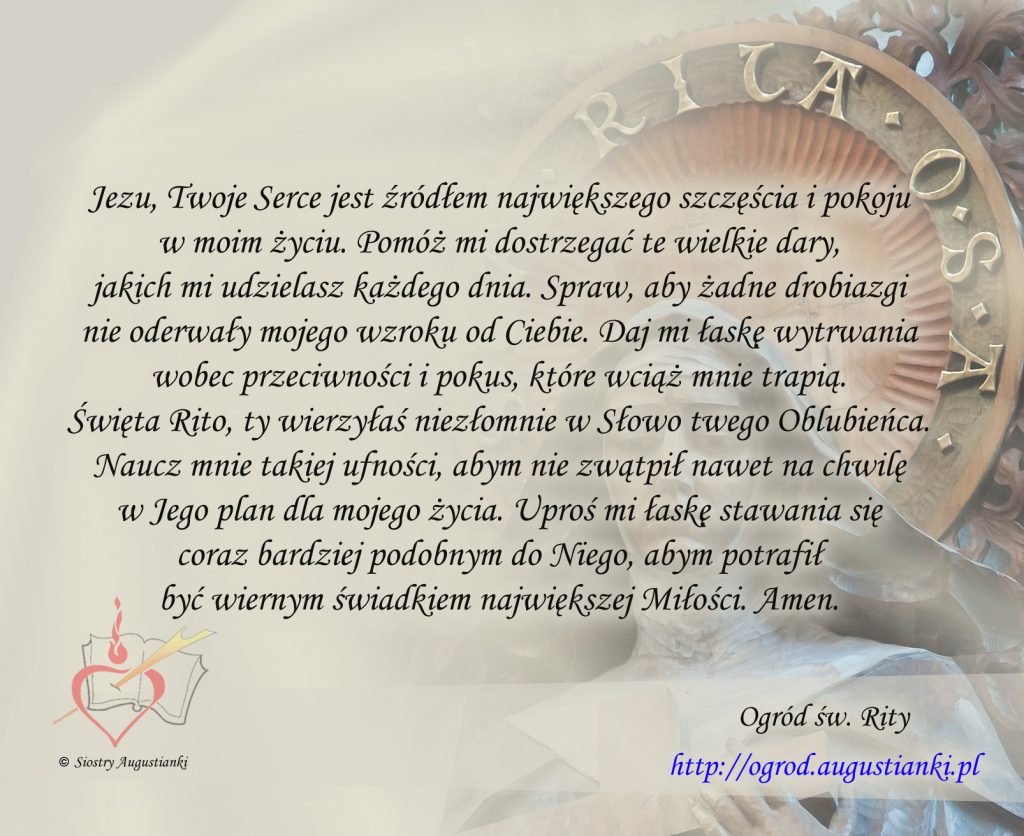 Święta Rito, ty wierzyłaś niezłomnie w Słowo twego Oblubieńca. Naucz mnie takiej ufności, abym nie zwątpił nawet na chwilę w Jego plan dla mojego życia. Uproś mi łaskę stawania się coraz bardziej podobnym do Niego, abym potrafił być wiernym świadkiem największej Miłości. Amen.