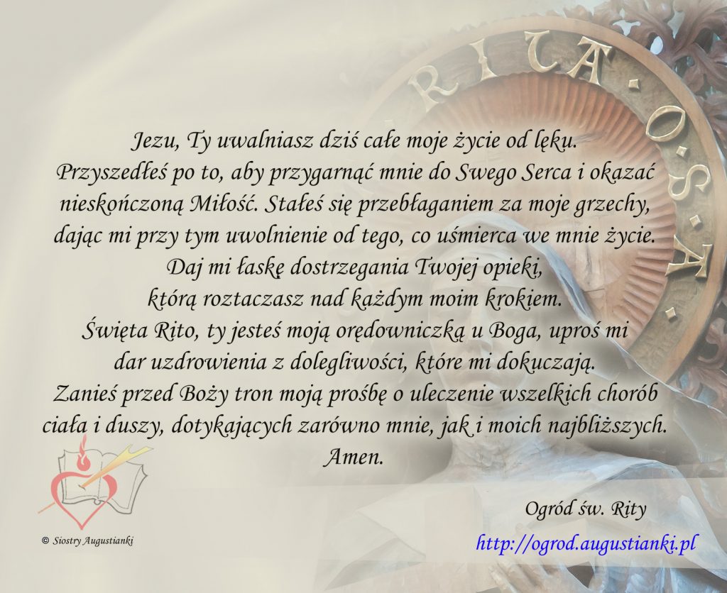 Święta Rito, ty jesteś moją orędowniczką u Boga, uproś mi dar uzdrowienia z dolegliwości, które mi dokuczają. Zanieś przed Boży tron moją prośbę o uleczenie wszelkich chorób ciała i duszy, dotykających zarówno mnie, jak i moich najbliższych. Amen.