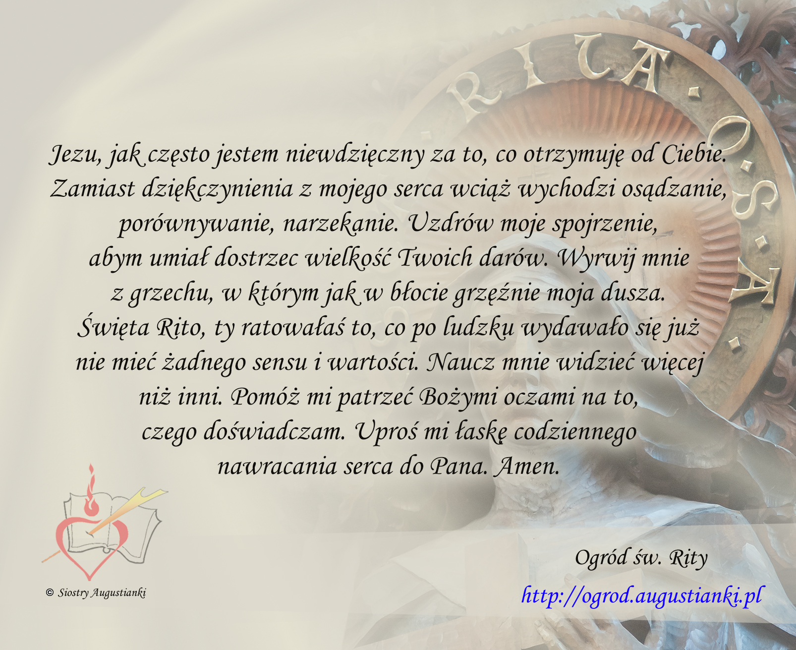 Święta Rito, ty ratowałaś to, co po ludzku wydawało się już nie mieć żadnego sensu i wartości. Naucz mnie widzieć więcej niż inni. Pomóż mi patrzeć Bożymi oczami na to, czego doświadczam. Uproś mi łaskę codziennego nawracania serca do Pana. Amen.