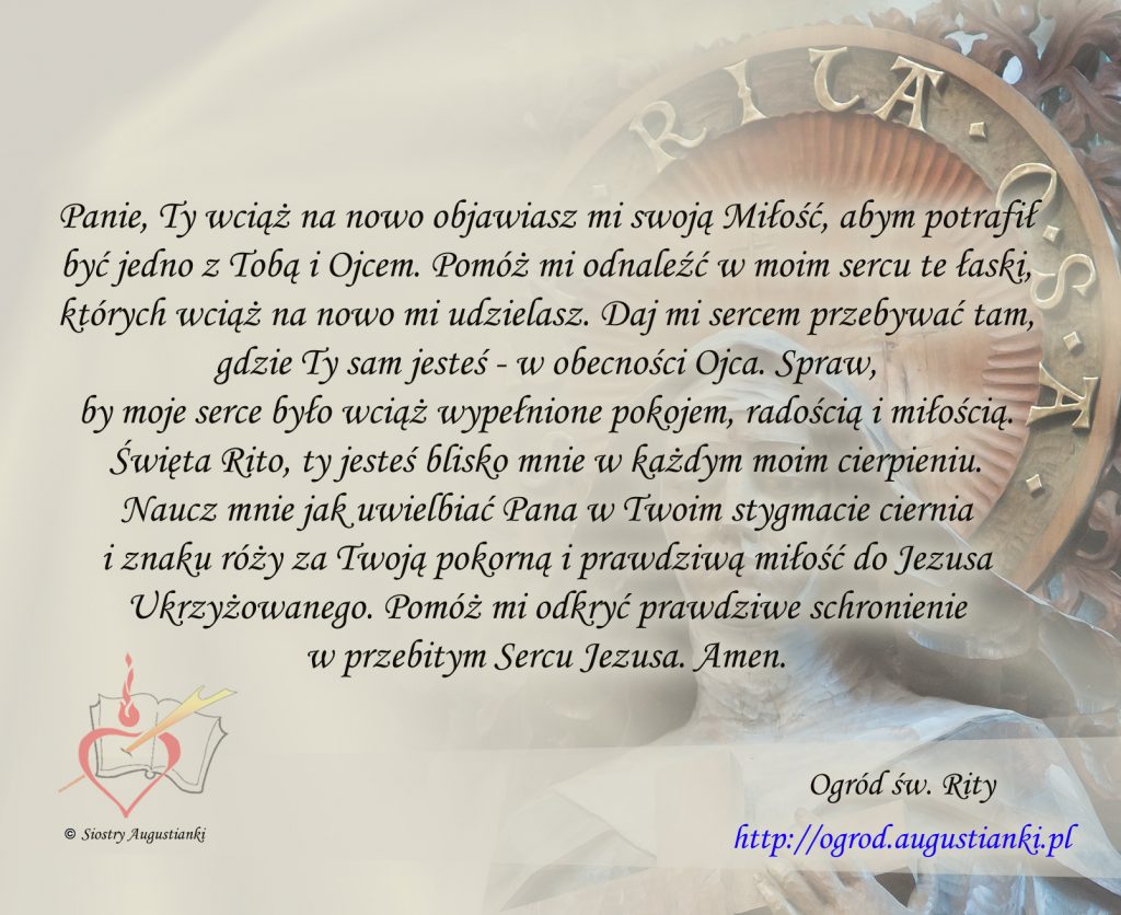 Święta Rito, ty jesteś blisko mnie w każdym moim cierpieniu. Naucz mnie jak uwielbiać Pana w Twoim stygmacie ciernia i znaku róży za Twoją pokorną i prawdziwą miłość do Jezusa Ukrzyżowanego. Pomóż mi odkryć prawdziwe schronienie w przebitym Sercu Jezusa. Amen.
