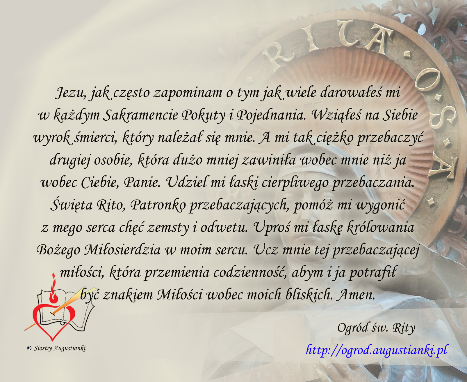 Święta Rito, Patronko przebaczających, pomóż mi wygonić z mego serca chęć zemsty i odwetu. Uproś mi łaskę królowania Bożego Miłosierdzia w moim sercu. Ucz mnie tej przebaczającej miłości, która przemienia codzienność, abym i ja potrafił być znakiem Miłości wobec moich bliskich. Amen.