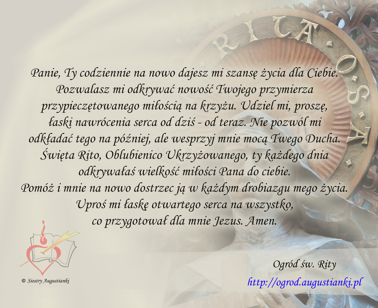 Święta Rito, Oblubienico Ukrzyżowanego, ty każdego dnia odkrywałaś wielkość miłości Pana do ciebie. Pomóż i mnie na nowo dostrzec ją w każdym drobiazgu mego życia. Uproś mi łaskę otwartego serca na wszystko, co przygotował dla mnie Jezus. Amen.
