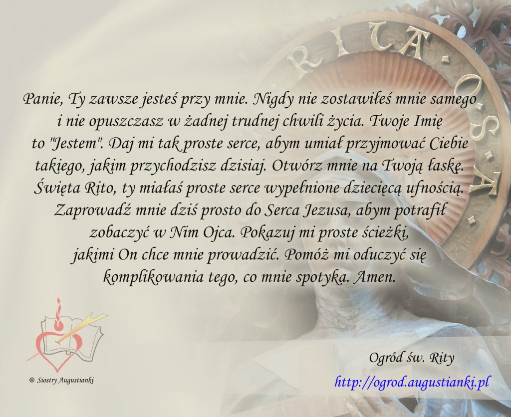 Święta Rito, ty miałaś proste serce wypełnione dziecięcą ufnością. Zaprowadź mnie dziś prosto do Serca Jezusa, abym potrafił zobaczyć w Nim Ojca. Pokazuj mi proste ścieżki, jakimi On chce mnie prowadzić. Pomóż mi oduczyć się komplikowania tego, co mnie spotyka. Amen.