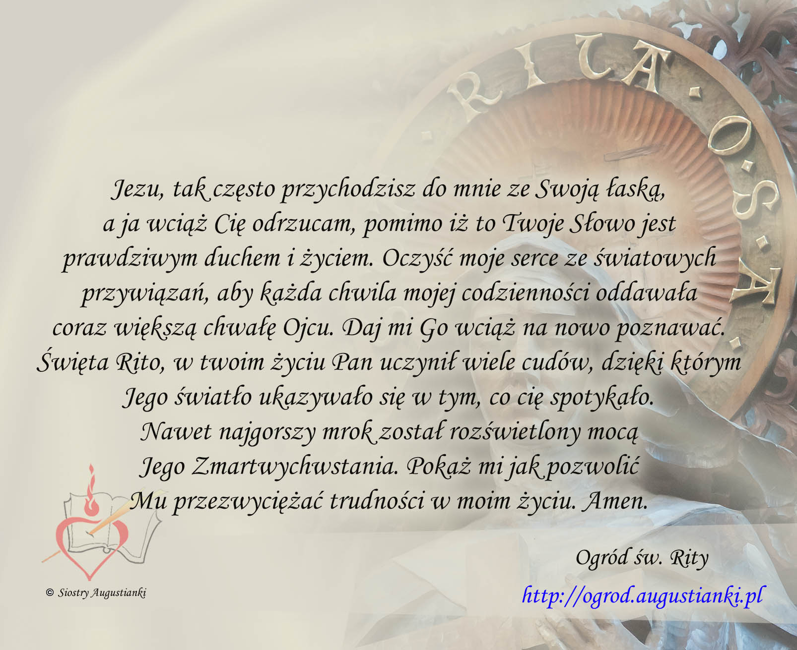 Święta Rito, w twoim życiu Pan uczynił wiele cudów, dzięki którym Jego światło ukazywało się w tym, co cię spotykało. Nawet najgorszy mrok został rozświetlony mocą Jego Zmartwychwstania. Pokaż mi jak pozwolić Mu przezwyciężać trudności w moim życiu. Amen.