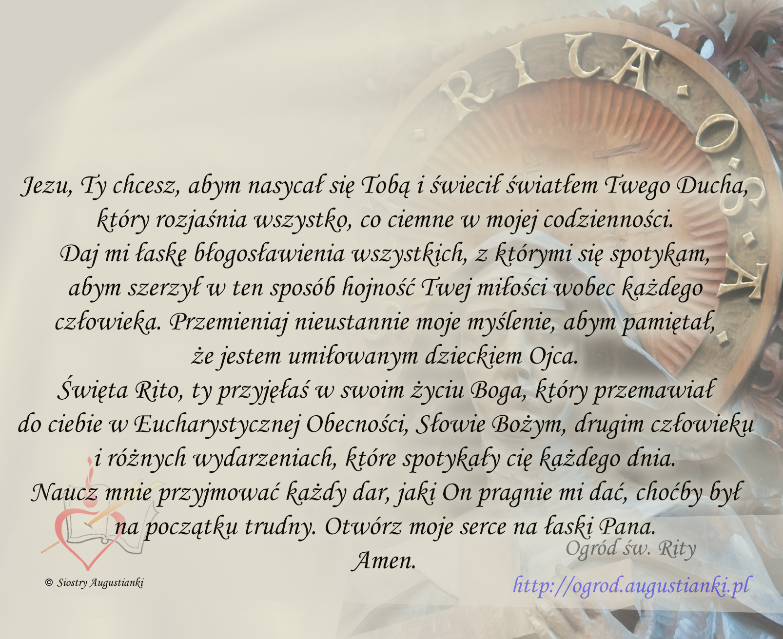 Święta Rito, ty przyjęłaś w swoim życiu Boga, który przemawiał do ciebie w Eucharystycznej Obecności, Słowie Bożym, drugim człowieku i różnych wydarzeniach, które spotykały cię każdego dnia. Naucz mnie przyjmować każdy dar, jaki On pragnie mi dać, choćby był na początku trudny. Otwórz moje serce na łaski Pana. Amen.