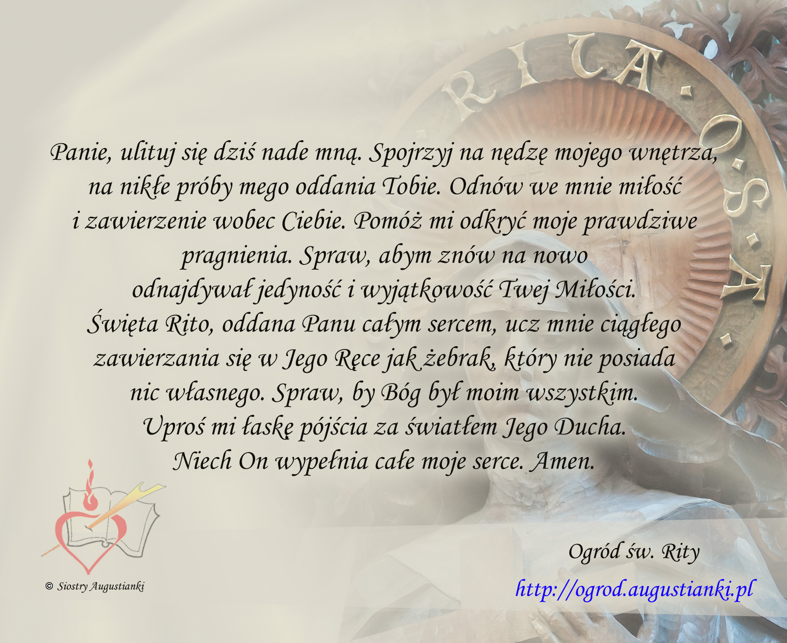 Święta Rito, oddana Panu całym sercem, ucz mnie ciągłego zawierzania się w Jego Ręce jak żebrak, który nie posiada nic własnego. Spraw, by Bóg był moim wszystkim. Uproś mi łaskę pójścia za światłem Jego Ducha. Niech On wypełnia całe moje serce. Amen.