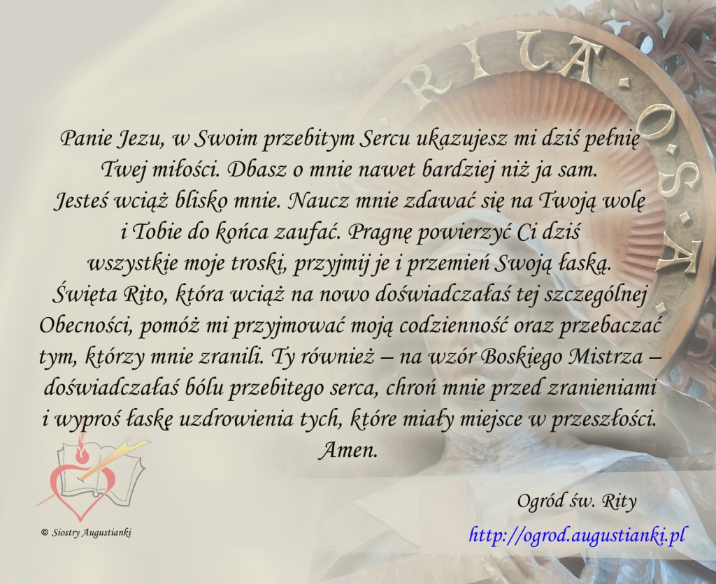 Święta Rito, która wciąż na nowo doświadczałaś tej szczególnej Obecności, pomóż mi przyjmować moją codzienność oraz przebaczać tym, którzy mnie zranili. Ty również – na wzór Boskiego Mistrza – doświadczałaś bólu przebitego serca, chroń mnie przed zranieniami i wyproś łaskę uzdrowienia tych, które miały miejsce w przeszłości. Amen.