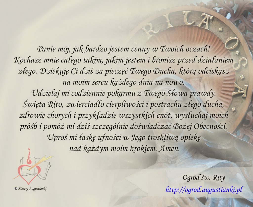 Święta Rito, zwierciadło cierpliwości i postrachu złego ducha, zdrowie chorych i przykładzie wszystkich cnót, wysłuchaj moich próśb i pomóż mi dziś szczególnie doświadczać Bożej Obecności. Uproś mi łaskę ufności w Jego troskliwą opiekę nad każdym moim krokiem. Amen.