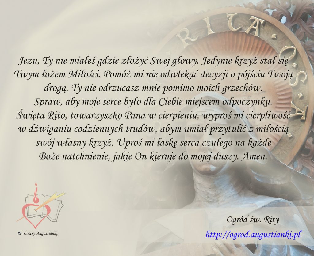 Święta Rito, towarzyszko Pana w cierpieniu, wyproś mi cierpliwość w dźwiganiu codziennych trudów, abym umiał przytulić z miłością swój własny krzyż. Uproś mi łaskę serca czułego na każde Boże natchnienie, jakie On kieruje do mojej duszy. Amen.
