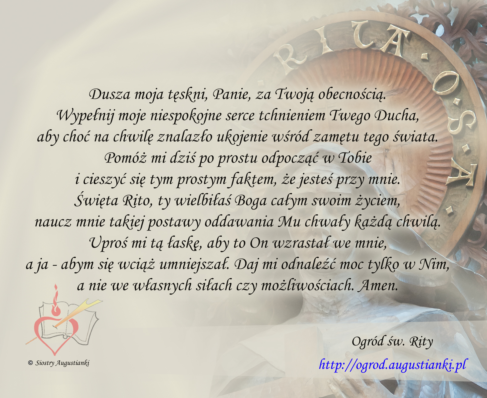 Święta Rito, ty wielbiłaś Boga całym swoim życiem, naucz mnie takiej postawy oddawania Mu chwały każdą chwilą. Uproś mi tą łaskę, aby to On wzrastał we mnie, a ja – abym się wciąż umniejszał. Daj mi odnaleźć moc tylko w Nim, a nie we własnych siłach czy możliwościach. Amen.