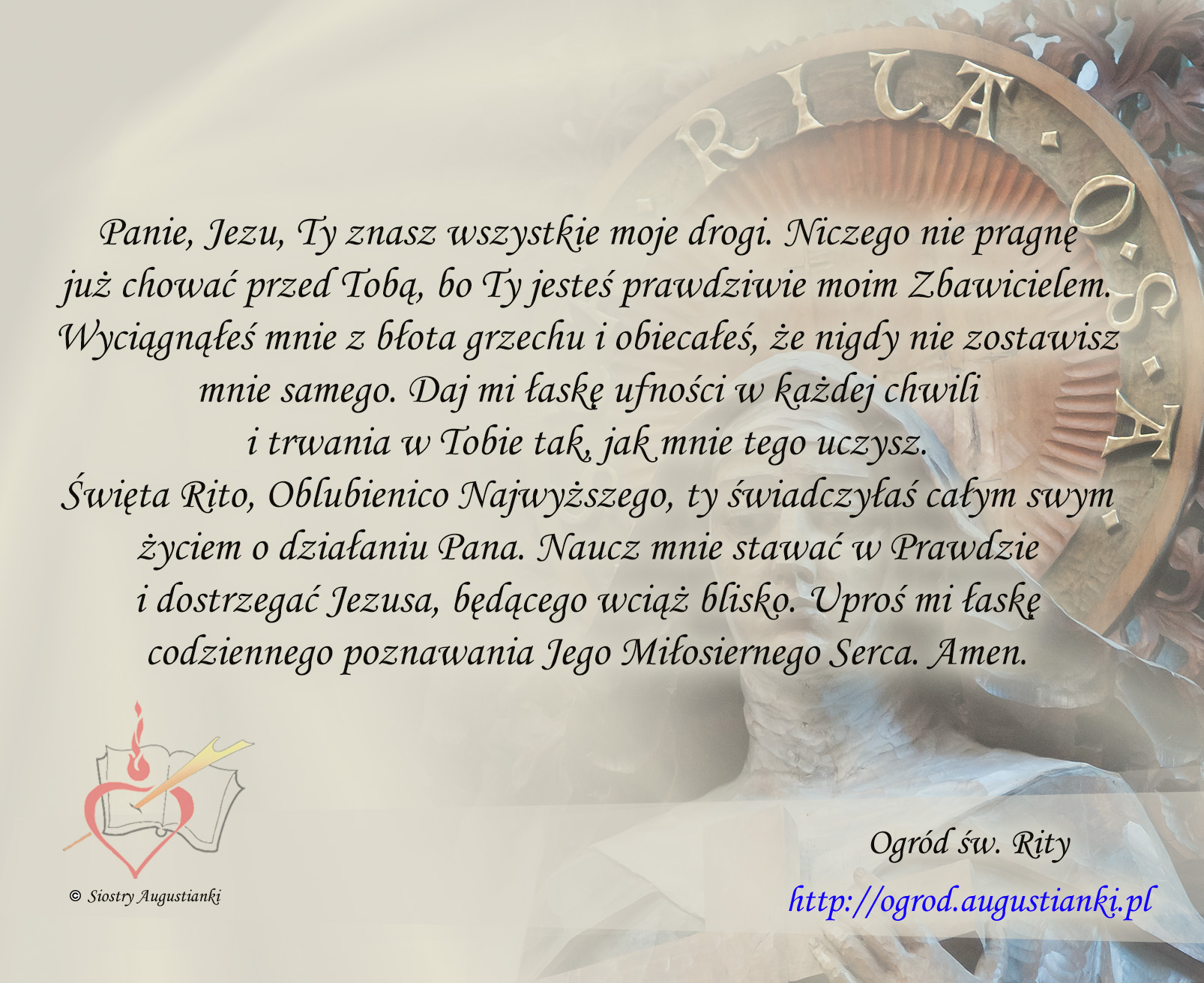 Św Rito dziękuję za otrzymane łaski i proszę o dar mądrości i wiary dla moich dzieci ocal od nałogów miej w opiece pomóż w mądrych wyborach życiowych i trwania przy Bogu