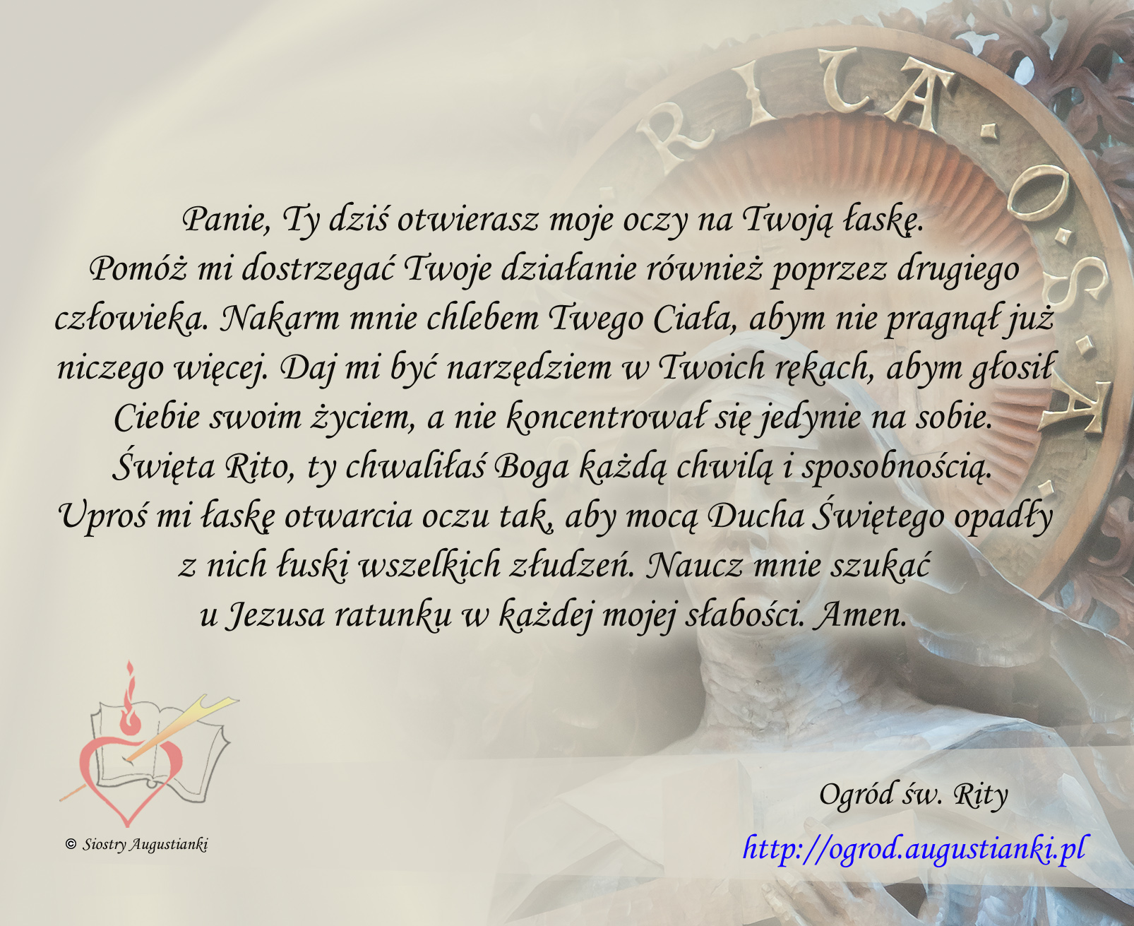 Święta Rito, ty chwaliłaś Boga każdą chwilą i sposobnością. Uproś mi łaskę otwarcia oczu tak, aby mocą Ducha Świętego opadły z nich łuski wszelkich złudzeń. Naucz mnie szukać u Jezusa ratunku w każdej mojej słabości. Amen.