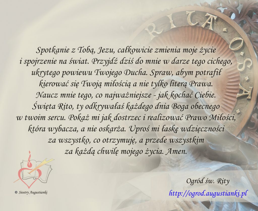 Święta Rito, ty odkrywałaś każdego dnia Boga obecnego w twoim sercu. Pokaż mi jak dostrzec i realizować Prawo Miłości, która wybacza, a nie oskarża. Uproś mi łaskę wdzięczności za wszystko, co otrzymuję, a przede wszystkim za każdą chwilę mojego życia. Amen.