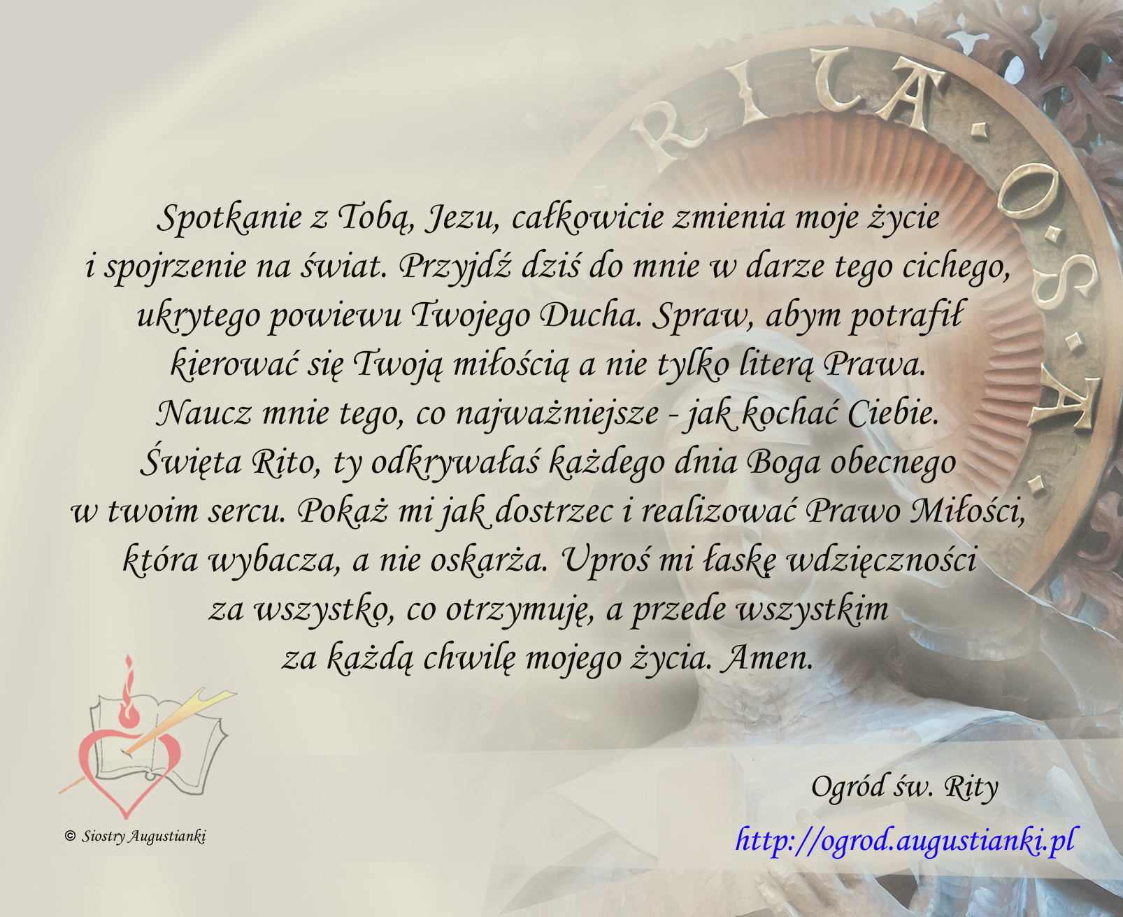 Święta Rito, ty odkrywałaś każdego dnia Boga obecnego w twoim sercu. Pokaż mi jak dostrzec i realizować Prawo Miłości, która wybacza, a nie oskarża. Uproś mi łaskę wdzięczności za wszystko, co otrzymuję, a przede wszystkim za każdą chwilę mojego życia. Amen.