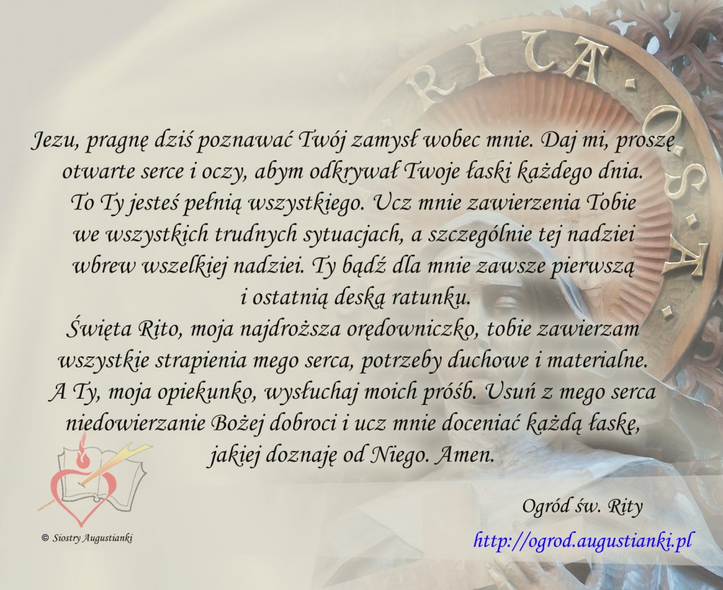 Święta Rito, moja najdroższa orędowniczko, tobie zawierzam wszystkie strapienia mego serca, potrzeby duchowe i materialne. A Ty, moja opiekunko, wysłuchaj moich próśb. Usuń z mego serca niedowierzanie Bożej dobroci i ucz mnie doceniać każdą łaskę, jakiej doznaję od Niego. Amen.