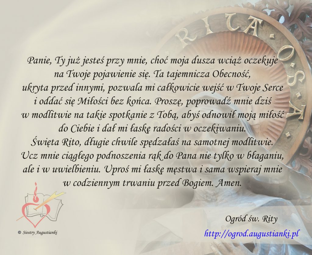 Święta Rito, długie chwile spędzałaś na samotnej modlitwie. Ucz mnie ciągłego podnoszenia rąk do Pana nie tylko w błaganiu, ale i w uwielbieniu. Uproś mi łaskę męstwa i sama wspieraj mnie w codziennym trwaniu przed Bogiem. Amen.