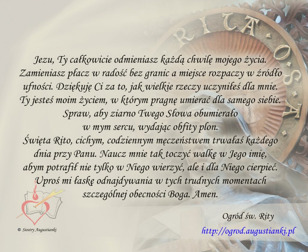 Święta Rito, cichym, codziennym męczeństwem trwałaś każdego dnia przy Panu. Naucz mnie tak toczyć walkę w Jego imię, abym potrafił nie tylko w Niego wierzyć, ale i dla Niego cierpieć. Uproś mi łaskę odnajdywania w tych trudnych momentach szczególnej obecności Boga. Amen.