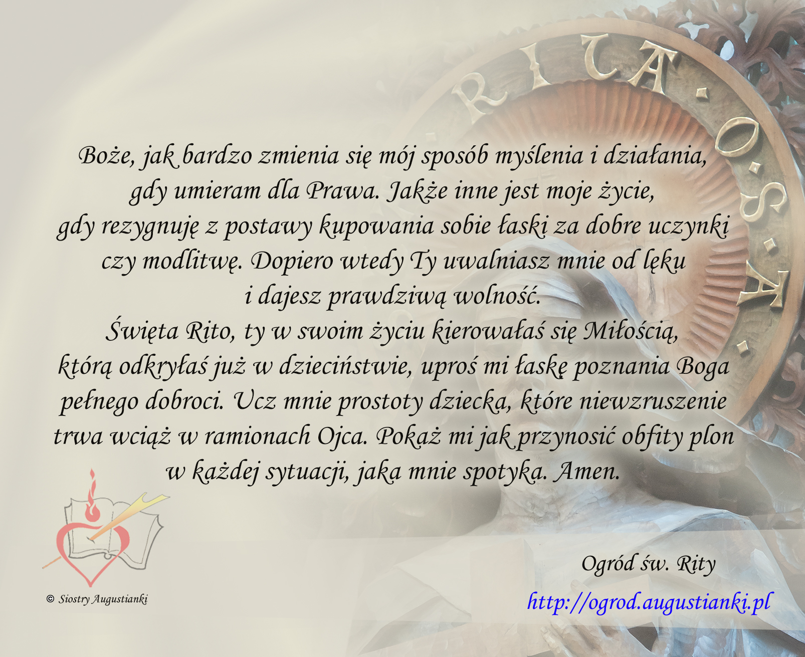 Święta Rito, ty w swoim życiu kierowałaś się Miłością, którą odkryłaś już w dzieciństwie, uproś mi łaskę poznania Boga pełnego dobroci. Ucz mnie prostoty dziecka, które niewzruszenie trwa wciąż w ramionach Ojca. Pokaż mi jak przynosić obfity plon w każdej sytuacji, jaka mnie spotyka. Amen.