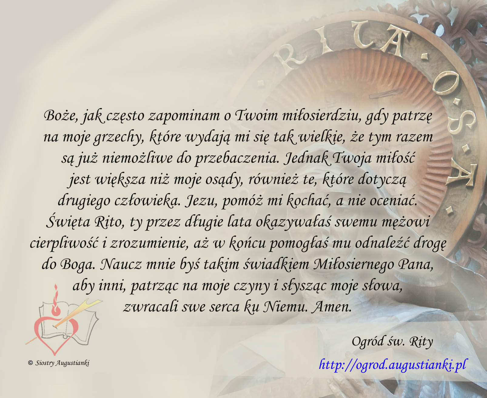 Święta Rito, ty przez długie lata okazywałaś swemu mężowi cierpliwość i zrozumienie, aż w końcu pomogłaś mu odnaleźć drogę do Boga. Naucz mnie byś takim świadkiem Miłosiernego Pana, aby inni, patrząc na moje czyny i słysząc moje słowa, zwracali swe serca ku Niemu. Amen.