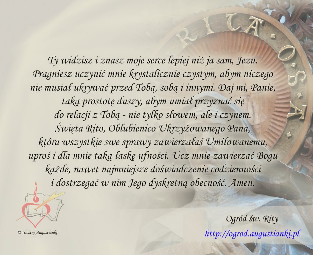 Święta Rito, Oblubienico Ukrzyżowanego Pana, która wszystkie swe sprawy zawierzałaś Umiłowanemu, uproś i dla mnie taką łaskę ufności. Ucz mnie zawierzać Bogu każde, nawet najmniejsze doświadczenie codzienności i dostrzegać w nim Jego dyskretną obecność. Amen.