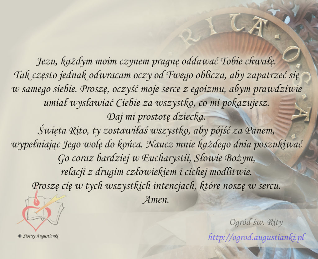 Święta Rito, ty zostawiłaś wszystko, aby pójść za Panem, wypełniając Jego wolę do końca. Naucz mnie każdego dnia poszukiwać Go coraz bardziej w Eucharystii, Słowie Bożym, relacji z drugim człowiekiem i cichej modlitwie. Proszę cię w tych wszystkich intencjach, które noszę w sercu. Amen.