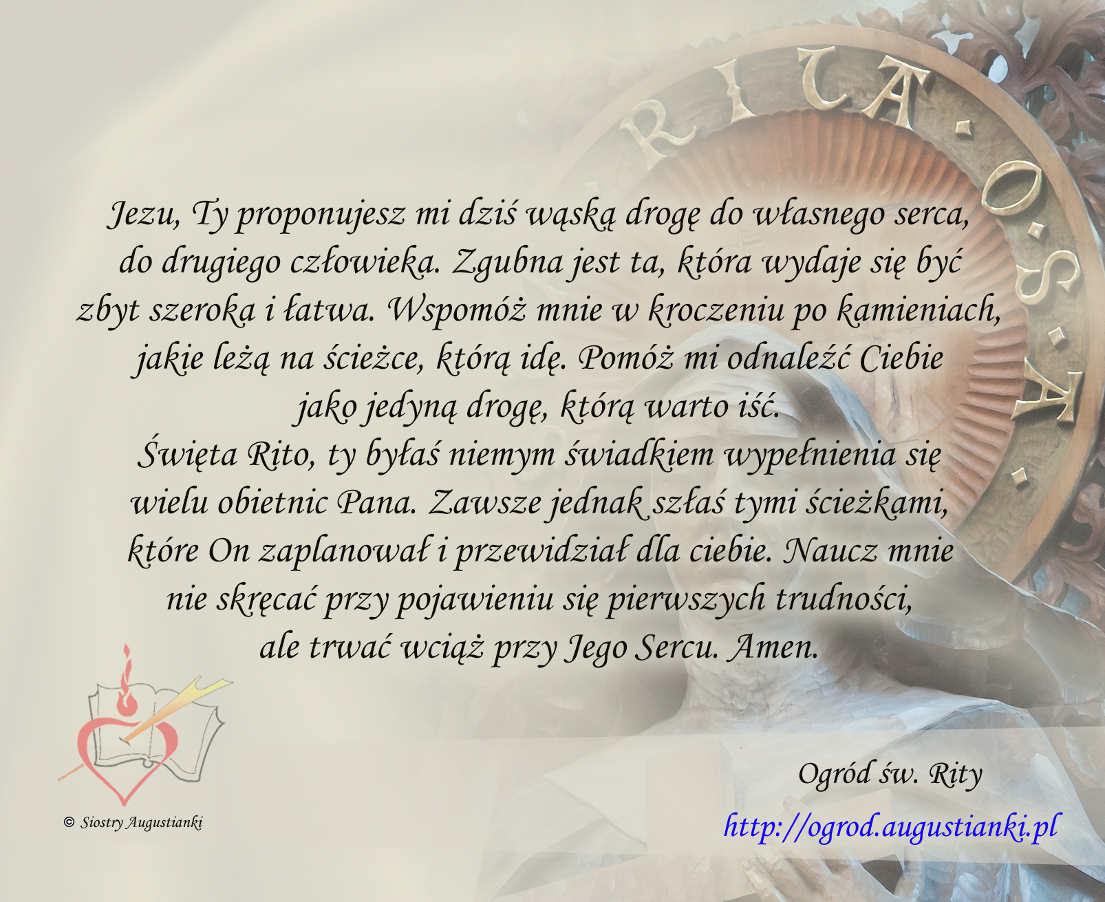 Święta Rito, ty byłaś niemym świadkiem wypełnienia się wielu obietnic Pana. Zawsze jednak szłaś tymi ścieżkami, które On zaplanował i przewidział dla ciebie. Naucz mnie nie skręcać przy pojawieniu się pierwszych trudności, ale trwać wciąż przy Jego Sercu. Amen.