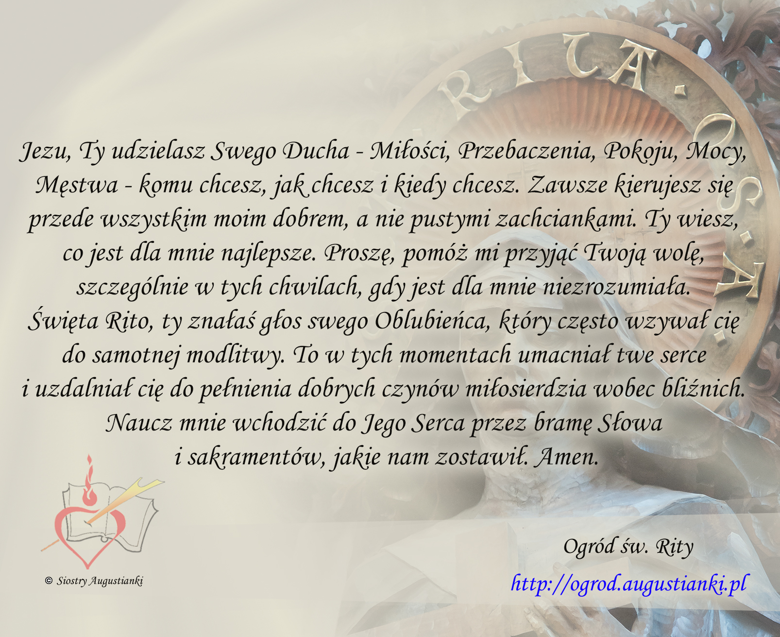 Kochana Rito, bardzo proszę, wymadlaj dla mnie łaskę i dar, oddawania wszystkiego Jezusowi i Maryii. Zawierzania całego życia – każdego dnia, bez konbinowania, co oddać, a co nie. Pomóż, mi bo sama nie dam rady. Proszę, pomóż, Kochana Rito, bądź, przy zawarciu umowy, bym nie została oszukana. Błagam, o uczciwych pracowników w banku, firmie, którzy będą podejmować decyzje. Proszę, módl się i błogosław, tym wsystkim osobą. Nie zostawiaj, mnie bez Twojej i Bożej pomocy. Dziękuję. Amen