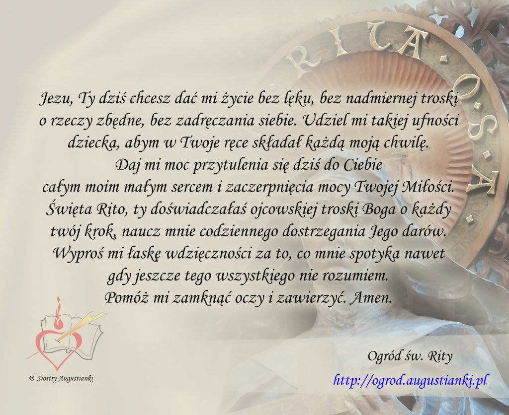 Święta Rito, ty doświadczałaś ojcowskiej troski Boga o każdy twój krok, naucz mnie codziennego dostrzegania Jego darów. Wyproś mi łaskę wdzięczności za to, co mnie spotyka nawet gdy jeszcze tego wszystkiego nie rozumiem. Pomóż mi zamknąć oczy i zawierzyć. Amen.