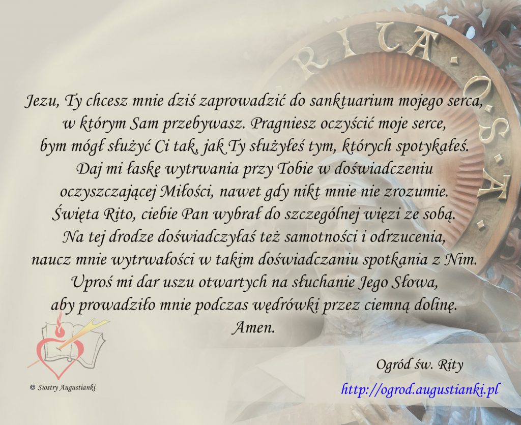 Święta Rito, ciebie Pan wybrał do szczególnej więzi ze sobą. Na tej drodze doświadczyłaś też samotności i odrzucenia, naucz mnie wytrwałości w takim doświadczaniu spotkania z Nim. Uproś mi dar uszu otwartych na słuchanie Jego Słowa, aby prowadziło mnie podczas wędrówki przez ciemną dolinę. Amen.