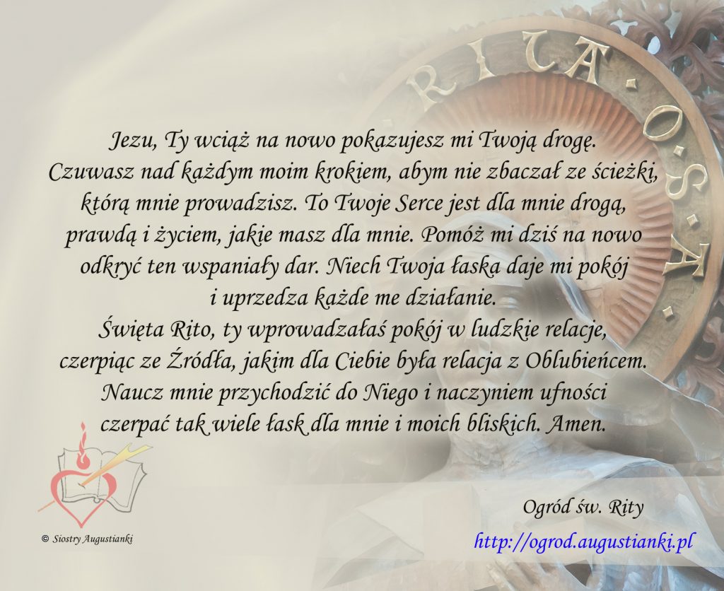 Święta Rito, ty wprowadzałaś pokój w ludzkie relacje, czerpiąc ze Źródła, jakim dla Ciebie była relacja z Oblubieńcem. Naucz mnie przychodzić do Niego i naczyniem ufności czerpać tak wiele łask dla mnie i moich bliskich. Amen.