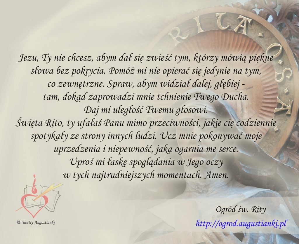 Święta Rito, ty ufałaś Panu mimo przeciwności, jakie cię codziennie spotykały ze strony innych ludzi. Ucz mnie pokonywać moje uprzedzenia i niepewność, jaka ogarnia me serce. Uproś mi łaskę spoglądania w Jego oczy w tych najtrudniejszych momentach. Amen.