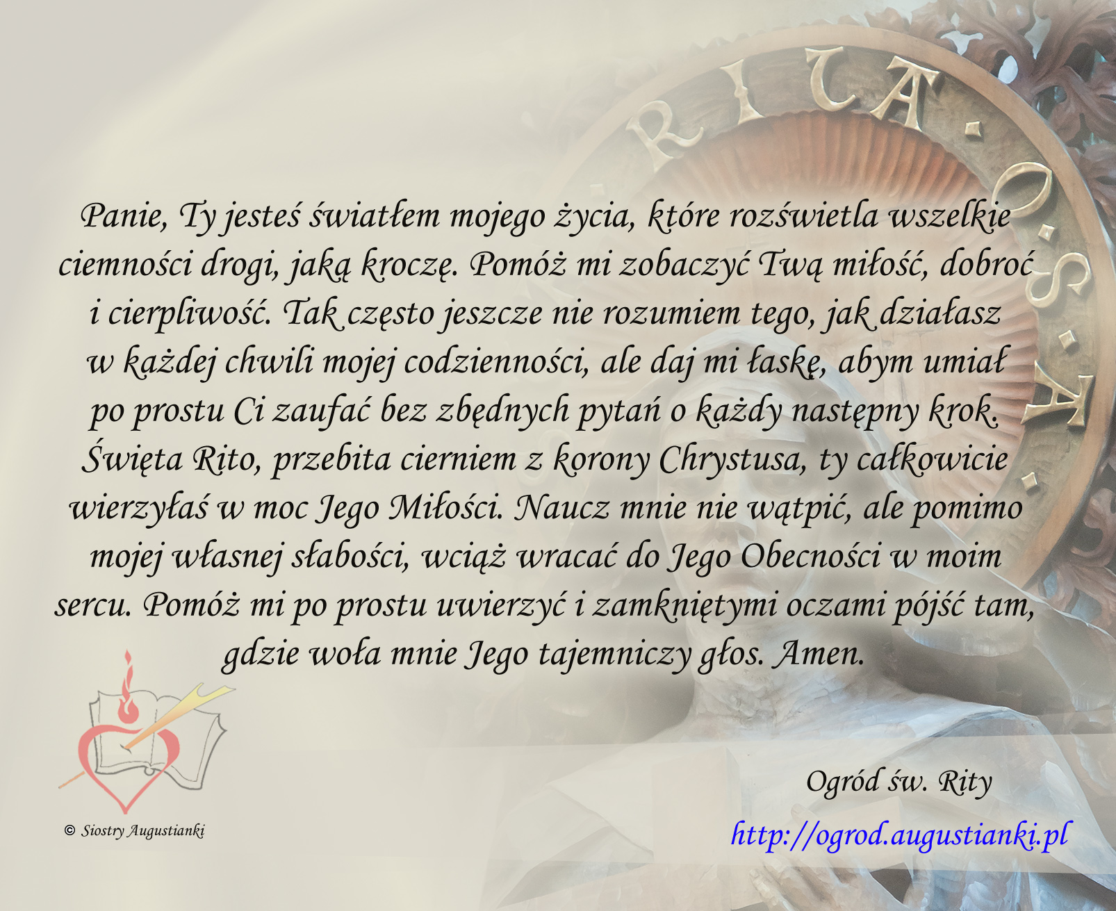 Święta Rito, przebita cierniem z korony Chrystusa, ty całkowicie wierzyłaś w moc Jego Miłości. Naucz mnie nie wątpić, ale pomimo mojej własnej słabości, wciąż wracać do Jego Obecności w moim sercu. Pomóż mi po prostu uwierzyć i zamkniętymi oczami pójść tam, gdzie woła mnie Jego tajemniczy głos. Amen.